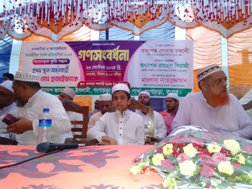 তানজানিয়া এবং আলজেরিয়ায় অনুষ্ঠিত আন্তর্জাতিক হিফজ প্রতিযোগিতায় ২০২৪ এ প্রথম স্থান অর্জন কারেন হাফেজ মোঃ হুজাইফা। রংপুরের গংগাচড়ার হাফেজ মোঃ হুজাইফাকে আজ ২৩শে সেপ্টেম্বর গনসংবর্ধনা দেওয়া হয়। টানা দ্বিতীয় বারের মত মোঃ হুজাইফা হিফজ প্রতিযোগিতায় বিশ্বচ্যাম্পিয়ন হয়।