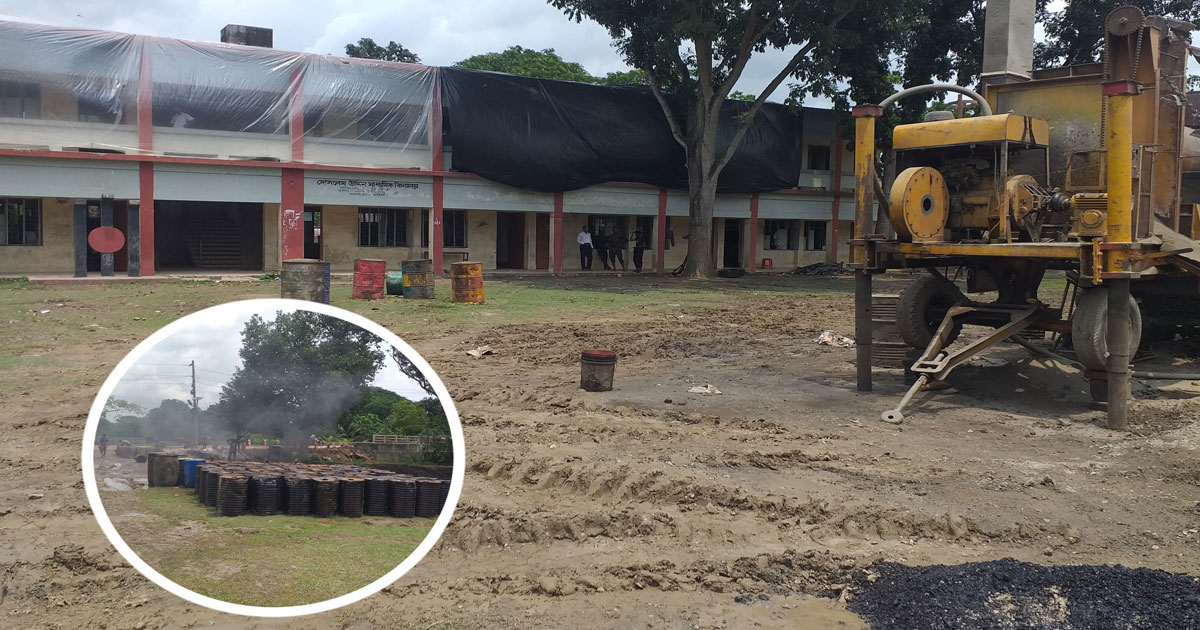 সরেজমিনে দেখা গেছে, বুধবার (২১ মে) বেলা ১০টার দিকে সদর উপজেলার কালীচরণপুর ইউনিয়নের মোসলেম উদ্দিন মাধ্যমিক বিদ্যালয়ের মাঠে সড়ক নির্মাণের পাথর-বালু ও বিটুমিনের ব্যারেল পড়ে আছে। পাশেই চলছে বিটুমিন জ্বালানোর কাজ। এতে কালো ক্ষতিকর ধোঁয়া ছড়িয়ে পড়ছে পুরো এলাকায়। ধোঁয়া এড়াতে স্কুলের বারান্দা ঢেকে ফেলা হয়েছে পলিথিনে। এতে ব্যাহত হচ্ছে পাঠদান। পরে শিক্ষার্থীদের স্বাস্থ্যহানীর শঙ্কায় বেলা ১১টার দিকে বাধ্য হয়ে স্কুল ছুটি ঘোষণা করা হয়।