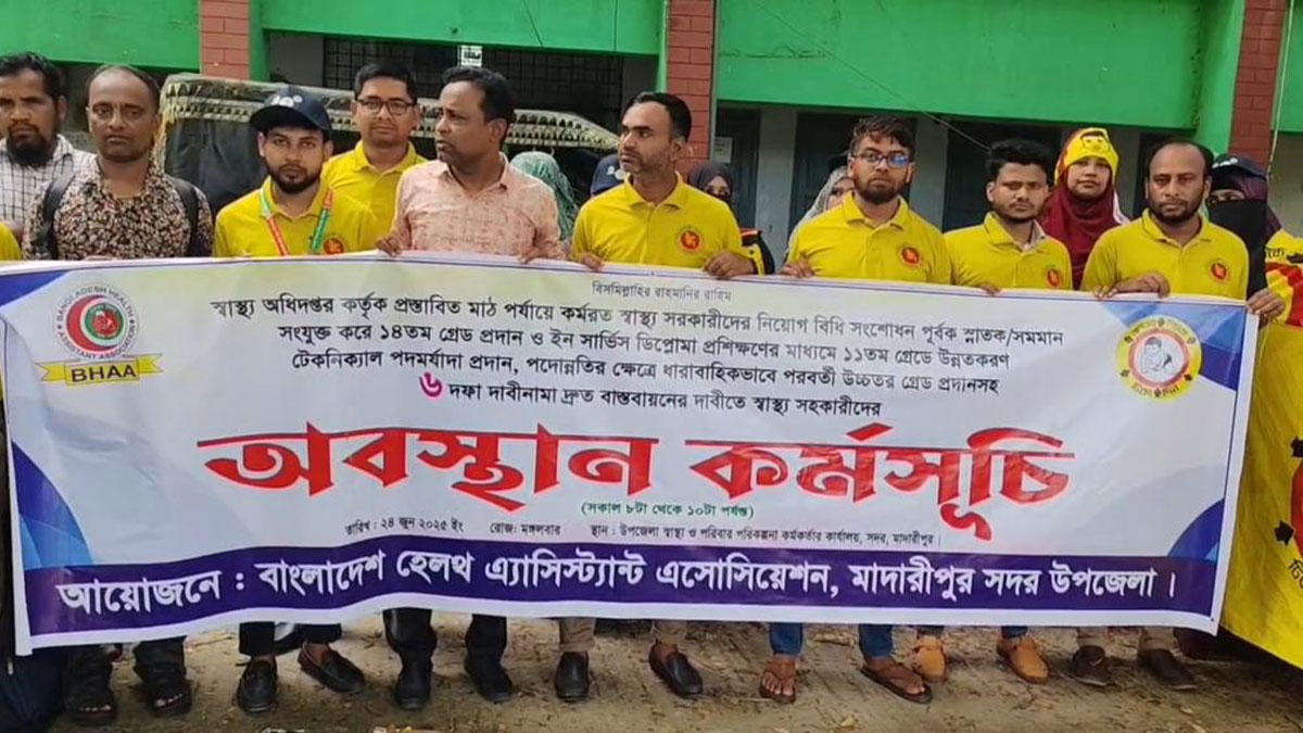 বাংলাদেশ হেলথ অ্যাসিস্ট্যান্ট এসোসিয়েশনের কেন্দ্রীয় কর্মসূচির অংশ হিসেবে নিয়োগবিধি সংশোধন করে ১৪তম গ্রেড প্রদানসহ ছয় দফা দাবিতে অবস্থান কর্মসূচি ও দুই ঘন্টা কর্মবিরতি পালন করেছেন মাদারীপুরের ৪টি উপজেলায় স্বাস্থ্য সহকারীরা।