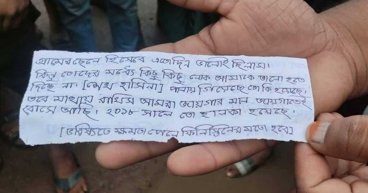চিরকুটে লেখা আছে- শেখ হাসিনা পালিয়ে গেছে তো কি হয়েছে, আমরা জায়গার মাল জায়গাতেই আছি, ‘ভবিষ্যতে ক্ষমতা পেলে ফিলিস্তিনের মত হবে’ ।