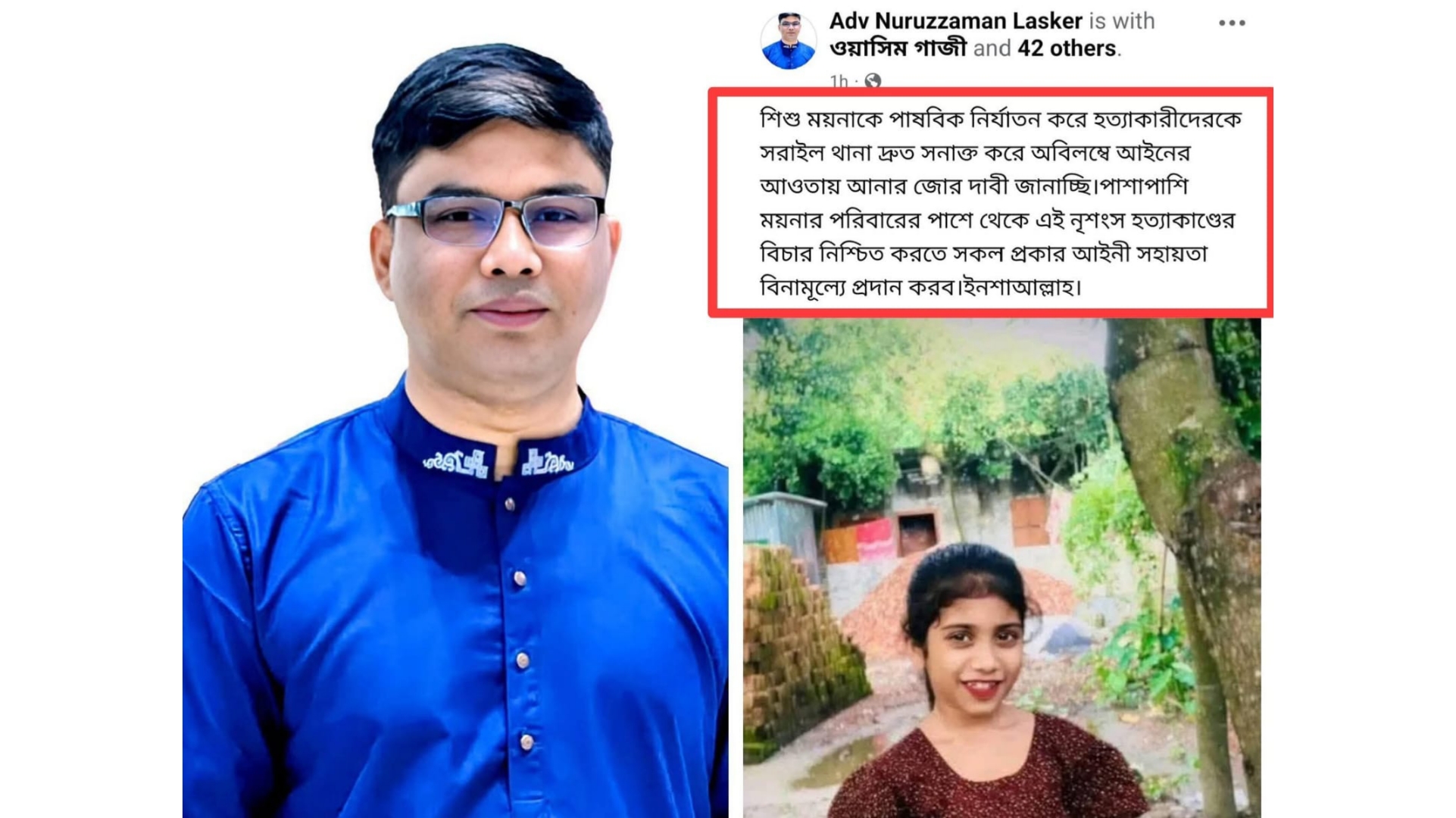 “শিশু ময়নাকে পাষবিক নির্যাতনের মাধ্যমে হত্যা করা হয়েছে। সরাইল থানা পুলিশ দ্রুত হত্যাকারীদের শনাক্ত করে আইনের আওতায় আনুক—এই দাবি জানাচ্ছি। পাশাপাশি ময়নার পরিবারকে আমি বিনামূল্যে সব ধরনের আইনি সহায়তা দেব, ইনশাআল্লাহ।”