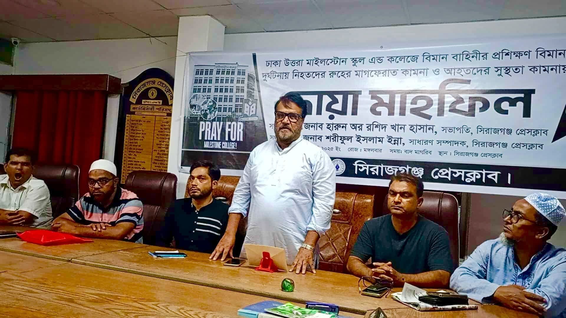 রাজধানীর উত্তরায় মাইলস্টোন স্কুল অ্যান্ড কলেজে সাম্প্রতিক ভয়াবহ বিমান দুর্ঘটনায় নিহত ও আহতদের স্মরণে সিরাজগঞ্জ প্রেসক্লাবের উদ্যোগে দোয়া মাহফিল অনুষ্ঠিত হয়েছে।
