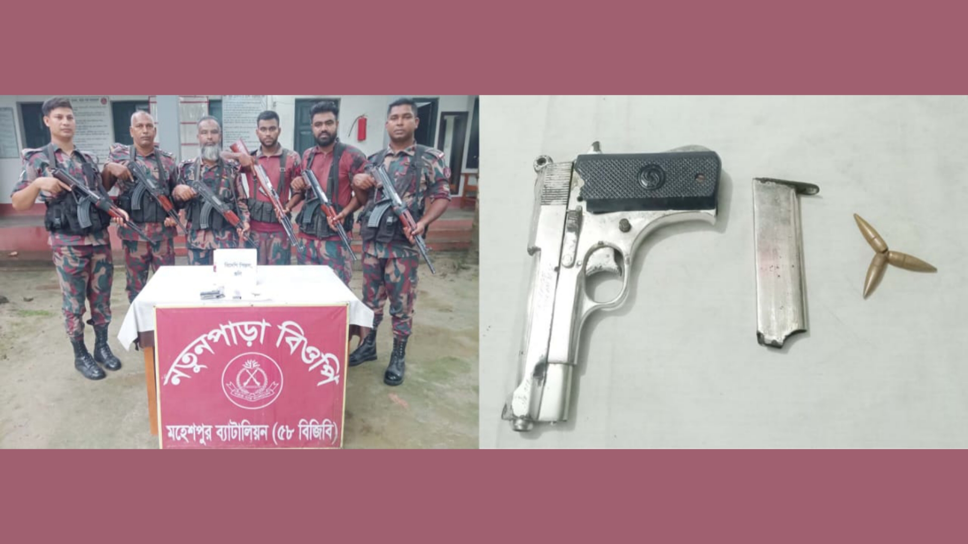 বিজ্ঞপ্তিতে আরও বলা হয়, বৃ্হস্পতিবার ভোরে বেসামরিক সোর্সের তথ্যের ভিত্তিতে ৫৮ ব্যাটালিয়নের অধীনস্থ নতুনপাড়া বিওপি'র একটি বিশেষ টহল দল গোয়ালপাড়া মোড় সংলগ্ন মোঃ জাকা মোল্লা এর ইট ভাটার পাশে অভিযান পরিচালনা করে।