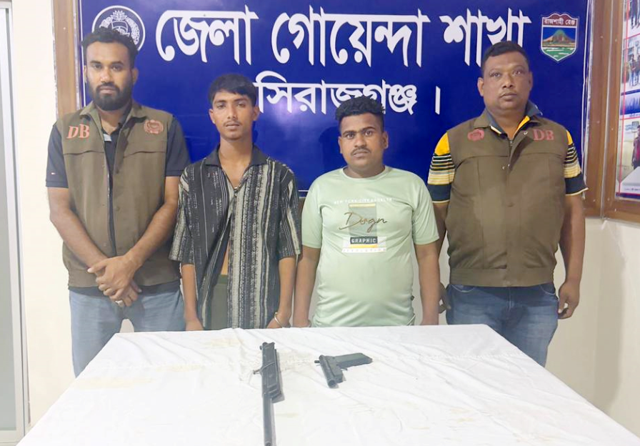 সিরাজগঞ্জের বেলকুচিতে অভিযান চালিয়ে দুটি দেশীয় ওয়ান শাটারগানসহ দুই অস্ত্র ব্যবসায়ীকে গ্রেপ্তার করেছে জেলা গোয়েন্দা (ডিবি) পুলিশ। গ্রেপ্তারকৃতরা হলেন—টাঙ্গাইল জেলার কালিহাতি উপজেলার আফজালপুর গ্রামের খলিল প্রামাণিকের ছেলে মো. আলমগীর (২৬) এবং বেলকুচি উপজেলার শান্তারমোড় এলাকার শাহজাহান আলীর ছেলে মো. সজিব (২২)।