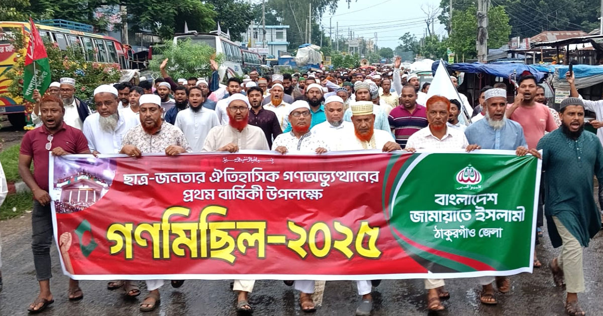 জুলাই- আগস্ট গণ-অভ্যুত্থানের এক বছর পূর্তি উপলক্ষ্যে গণমিছিল ও সমাবেশ করছে বাংলাদেশ জামায়াতে ইসলামী ঠাকুরগাঁও জেলা শাখা।