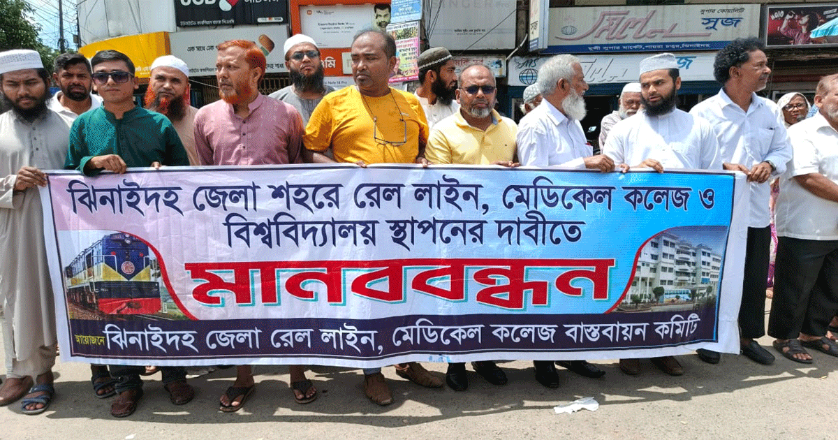 ঝিনাইদহ শহরে রেল লাইন, মেডিকেল কলেজ ও বিশ্ববিদ্যালয় স্থাপনের দাবিতে মানববন্ধন কর্মসূচি পালিত হয়েছে।