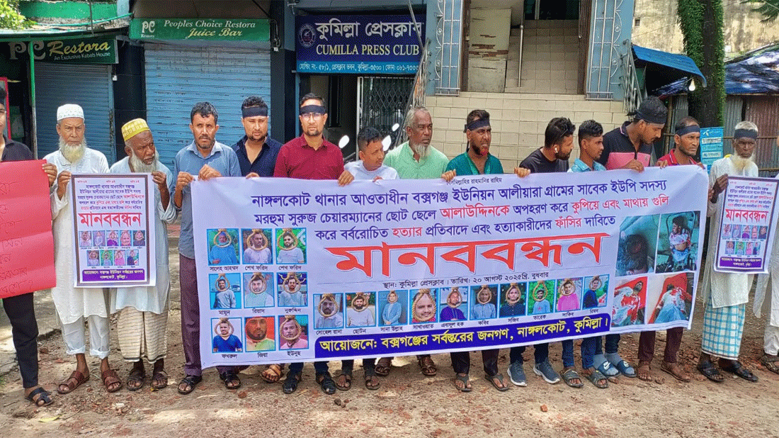 কুমিল্লায় সাবেক ইউপি সদস্য আলাউদ্দিনকে প্রকাশ্যে গুলি করে হত্যার বিচারের দাবিতে মানববন্ধন করেছে এলাকাবাসী।
