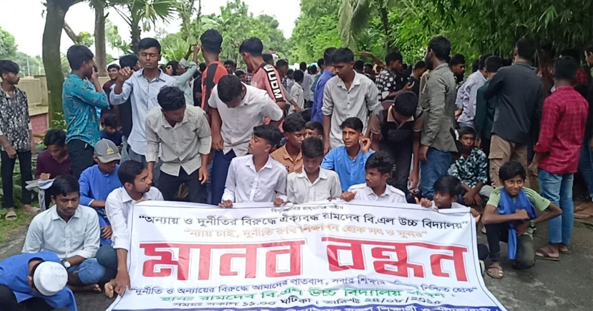 গাইবান্ধার সুন্দরগঞ্জ উপজেলার রামদেব বিএল উচ্চ বিদ্যালয়ের প্রধান শিক্ষক শফিকুল ইসলামের নানা অনিয়ম ও দুর্নীতির প্রতিবাদে মানববন্ধন অনুষ্ঠিত হয়েছে।