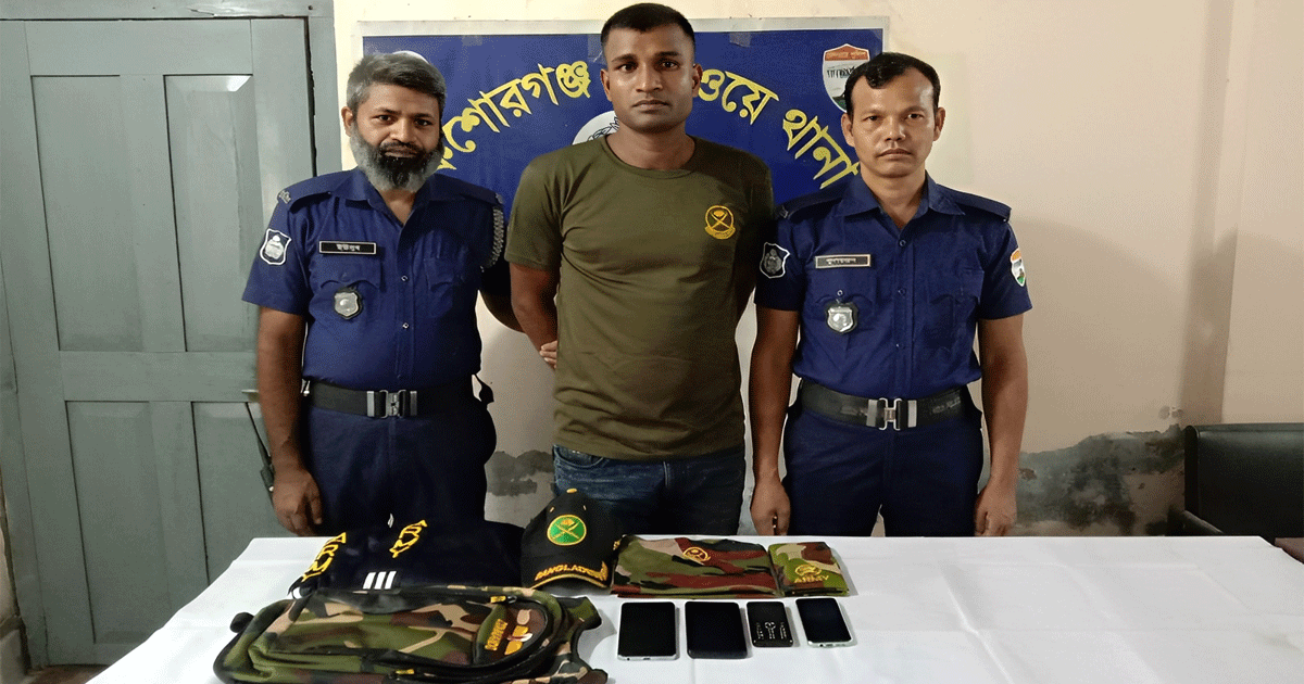 কিশোরগঞ্জে ট্রেনের যাত্রীদের ধরে নেওয়ার হুমকি দেওয়ার অভিযোগে মো. আলমগীর খা (৩৪) নামে এক ভুয়া সেনা সদস্যকে আটক করেছে রেলওয়ে জিআরপি থানা পুলিশ।