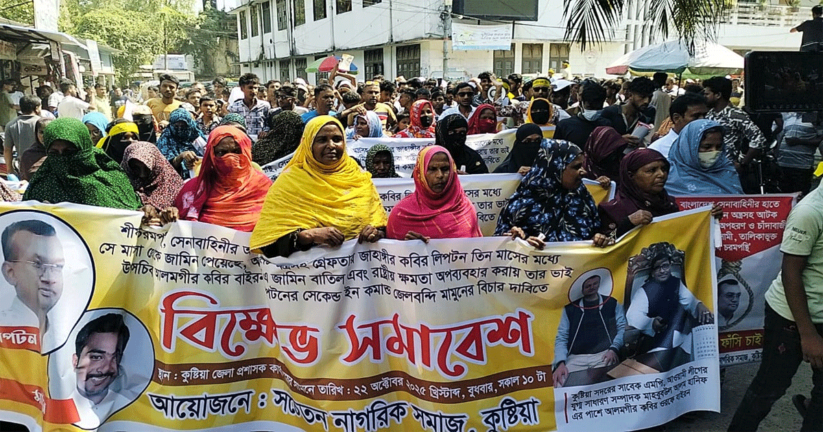 আমরা কুষ্টিয়ায় শান্তি প্রতিষ্ঠার স্বার্থে গত ৬ জুন শহরের এনএস রোডে শান্তিপূর্ণ মানববন্ধন কর্মসূচি পালন করেছি। সেখানে লিপটনের নির্যাতন-অত্যাচারের শিকার হওয়া ব্যক্তিরা প্রকাশ্যে বক্তব্য দিয়েছেন। গত ১৫ জুন আমরা কুষ্টিয়া জেলা প্রশাসকের কার্যালয়ের সামনে আবারও মানববন্ধন করে বিচার দাবিতে স্মারকলিপি দিয়েছি। লিপটনের নির্যাতনের শিকার শত শত নারী পুরুষ বিচার দাবিতে অংশ নেন। আজ আবারও আমরা কুষ্টিয়া শহরে বিক্ষোভ শেষে এখানে সমাবেশ করছি। শান্তিপ্রিয় মানুষের ঘুম হারাম করে দেওয়া এই লিপটন এবং মামুন যেন কোনভাবেই তাদের অপরাধের শান্তি থেকে মুক্তি না পায়। আমাদের দাবি একটাই, সেনাবাহিনী কর্তৃক অভিযান চালিয়ে অস্ত্রসহ আটকের পর সে মামলার জামিন বাতিল করতে হবে। আমরা দুর্ধরষ খুনি সন্ত্রাসী ও কুষ্টিয়াবাসীর আতঙ্ক লিপটন ও মামুনের উপযুক্ত শান্তি চাই।