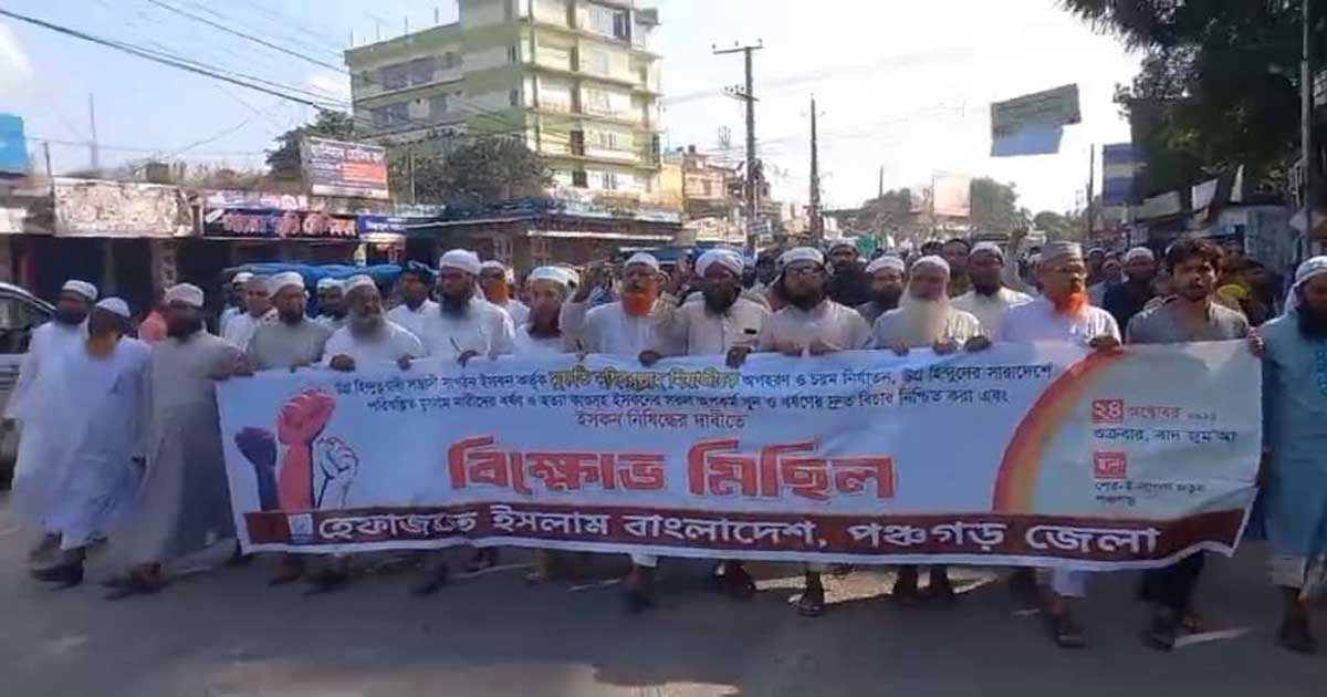 উগ্র হিন্দুত্ববাদী সংগঠন ইসকন কর্তৃক মুফতি মহিববুল্লাহ মিরাজীকে অপহরণ ও নির্যাতনের প্রতিবাদে এবং সারাদেশে পরিকল্পিত নারী নির্যাতন, ধর্ষণ ও হত্যাকাণ্ডসহ ইসকনের সকল অপরাধের দ্রুত বিচার ও সংগঠনটি নিষিদ্ধের দাবিতে বিক্ষোভ মিছিল ও প্রতিবাদ সমাবেশ করেছে হেফাজতে ইসলাম বাংলাদেশ, পঞ্চগড় জেলা শাখা।