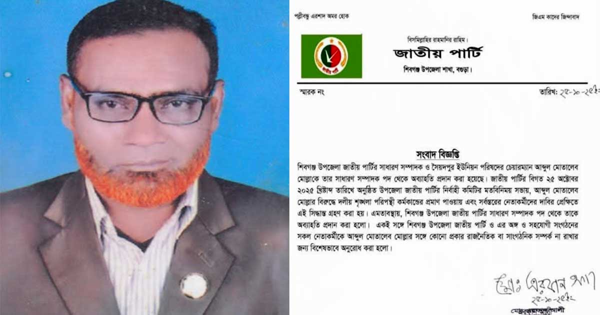 বগুড়ার শিবগঞ্জ উপজেলা জাতীয় পার্টির সাধারণ সম্পাদক ও সৈয়দপুর ইউনিয়ন পরিষদের চেয়ারম্যান আব্দুল মোত্তালেব মোল্লাকে দল থেকে অব্যাহতি দেওয়া হয়েছে।