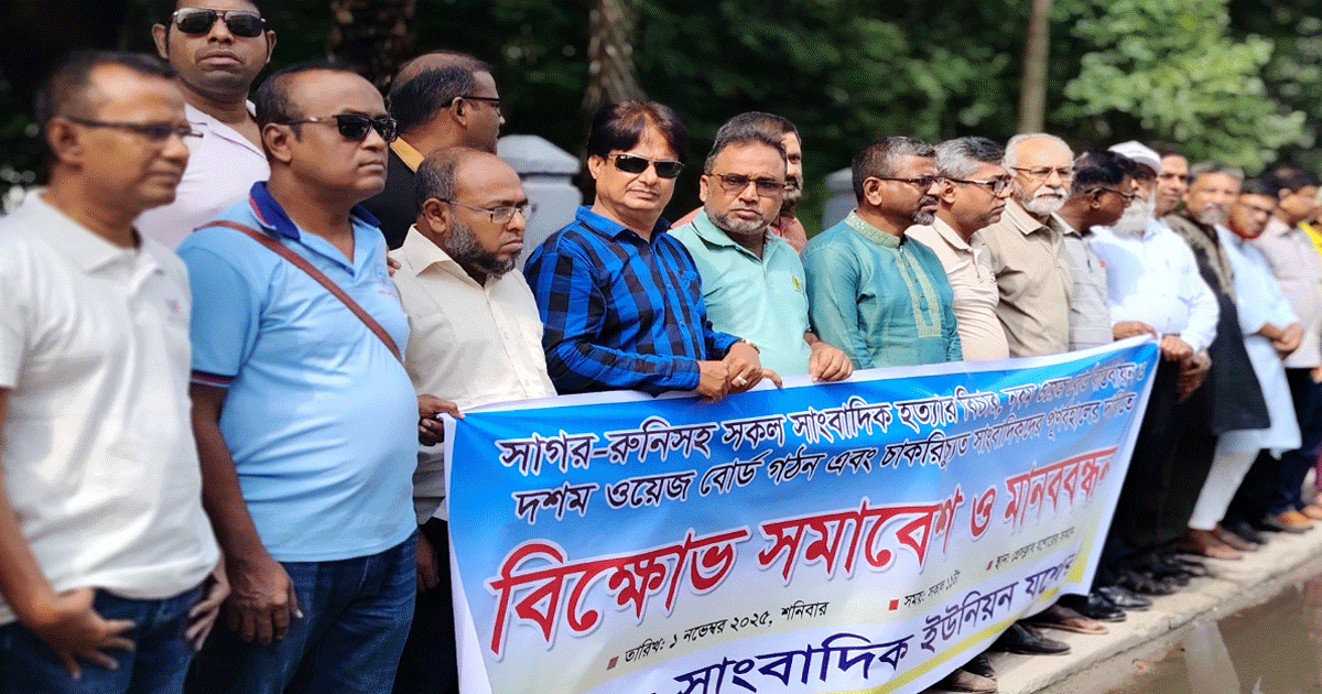 সাংবাদিক দম্পতি সাগর-রুনি হত্যাসহ দেশের সকল সাংবাদিক হত্যার দ্রুত বিচার, নবম ওয়েজ বোর্ড বাস্তবায়ন, দশম ওয়েজ বোর্ড গঠন এবং চাকরিচ্যুত সাংবাদিকদের পুনর্বহালের দাবিতে যশোরে মানববন্ধন অনুষ্ঠিত হয়েছে।