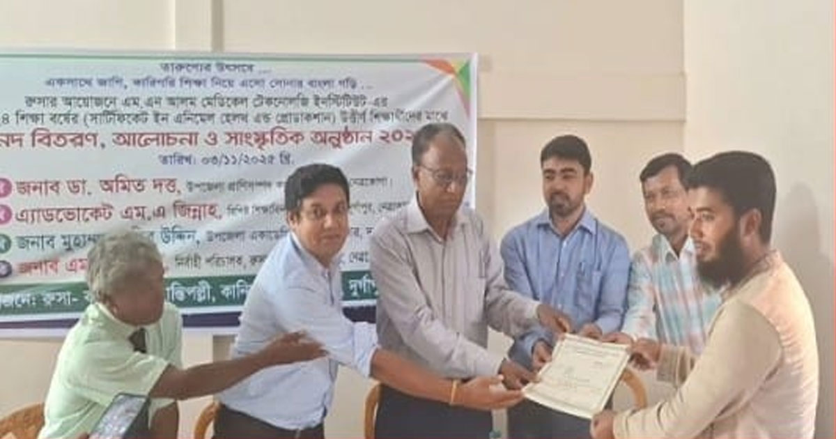 গত সোমবার (০৩ নভেম্বর) বাংলাদেশ কারিগরি শিক্ষা বোর্ডের আওতায় বেসরকারি উন্নয়ন সংস্থা ‘রুসা বাংলাদেশ’ আয়োজিত “সার্টিফিকেট ইন অ্যানিমেল হেলথ অ্যান্ড প্রোডাকশন” এক বছর মেয়াদি কোর্সের সনদ বিতরণ অনুষ্ঠিত হয়।