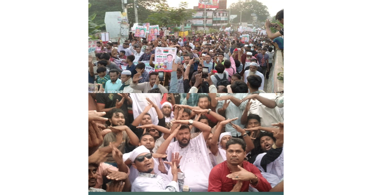 সমাবেশ শেষে তারা কাফনের কাপড় পরে শহরের প্রধান প্রধান সড়কে বিক্ষোভ মিছিল বের করেন। মিছিলে স্লোগান ওঠে – “দূর দিনের কবির ভাই… ধানের শীষের প্রার্থী তাকে চাই!”