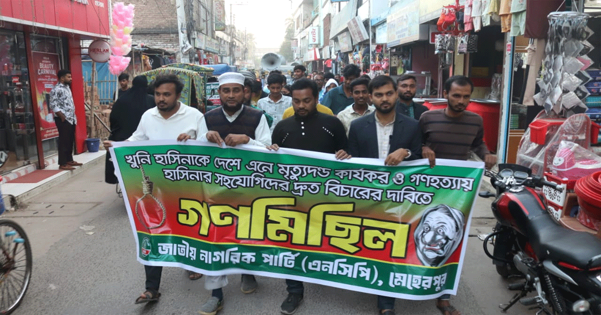 খুনি হাসিনাকে দেশে এনে মৃত্যুদণ্ড কার্যকর ও গণহত্যায় হাসিনার সহযোগীদের দ্রুত বিচারের দাবিতে মেহেরপুর জেলা এনসিপির গণ মিছিল হয়েছে।