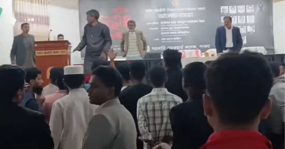 পাবনা সরকারি এডওয়ার্ড কলেজে শহীদ বুদ্ধিজীবী দিবস উপলক্ষে আয়োজিত অনুষ্ঠানে কলেজ শাখা ছাত্রশিবিরের সাধারণ সম্পাদকের বক্তব্যকে কেন্দ্র করে হট্টগোল ও অনুষ্ঠান বর্জনের ঘটনা ঘটেছে। বক্তব্যে জামায়াতের প্রয়াত নেতা মতিউর রহমান নিজামী ও গোলাম আযমকে স্বাধীনতাযুদ্ধের ‘সূর্যসন্তান’ ও দেশপ্রেমিক হিসেবে উল্লেখ করায় ছাত্রদল নেতা-কর্মীরা প্রতিবাদ জানিয়ে অনুষ্ঠান বর্জন করেন।