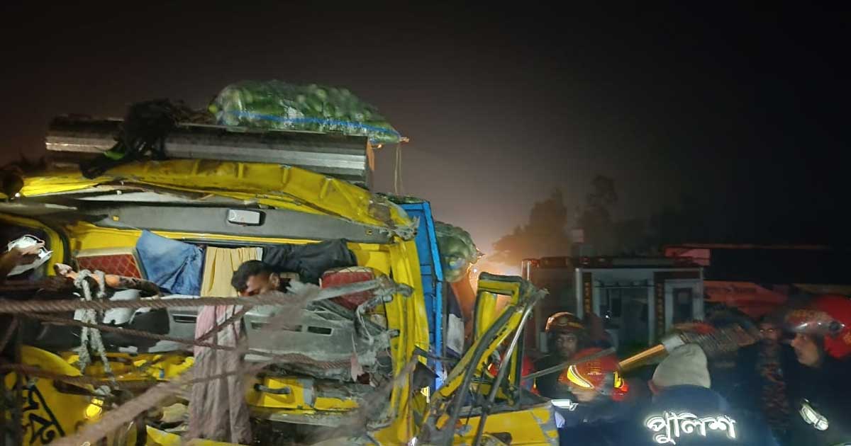 ফায়ার সার্ভিস ও পুলিশ সূত্রে জানা যায়, ভোরের দিকে মহাসড়কের পাশে দাঁড়িয়ে থাকা একটি ট্রাকের পেছনে নিয়ন্ত্রণ হারিয়ে সবজিবাহী ট্রাকটি সজোরে ধাক্কা দেয়। এতে সবজিবাহী ট্রাকটির চালক, সহকারী ও কেবিনে থাকা সবজি ব্যবসায়ী ভেতরে আটকে পড়েন।