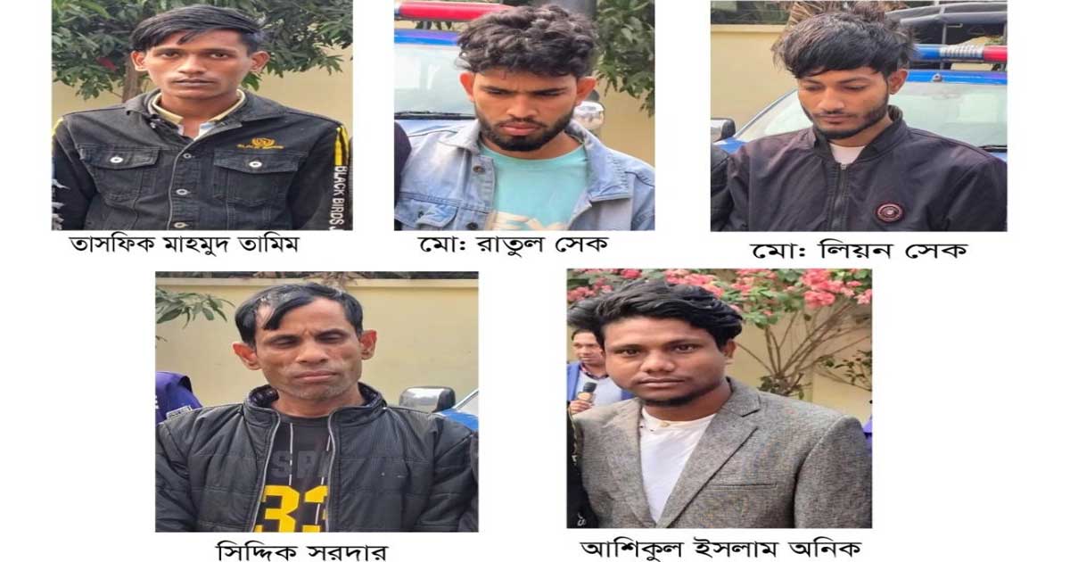 গ্রেপ্তারকৃত আসামিরা হলেন, শহরের আলীপুর গোরস্থান এলাকার মামুন মোল্লার ছেলে তামিম মোল্লা, আলীপুর কানাই মাতুব্বরের মোড়ের সরোয়ার হোসেনের ছেলে আনিক ইসলাম, একই এলাকার ইউনুছ শেখের ছেলে রাতুল শেখ, চরমাধবদিয়া ইউনিয়নের হামেদ মুন্সী ডাঙ্গীর আনোয়ার শেখের ছেলে লিয়ন শেখ, শহরের শোভারামপুর এলাকার সাইদা গাছীর ছেলে সিদ্দিক সরদার, সদর উপজেলার ইব্রাহিমদী গ্রামের আব্দুল মান্নানের ছেলে এনামুল ও নড়াইল জেলার নড়াগাতী থানার চান্দেরচর গ্রামের মুক্তার শেখের ছেলে সাব্বির হোসেন।
