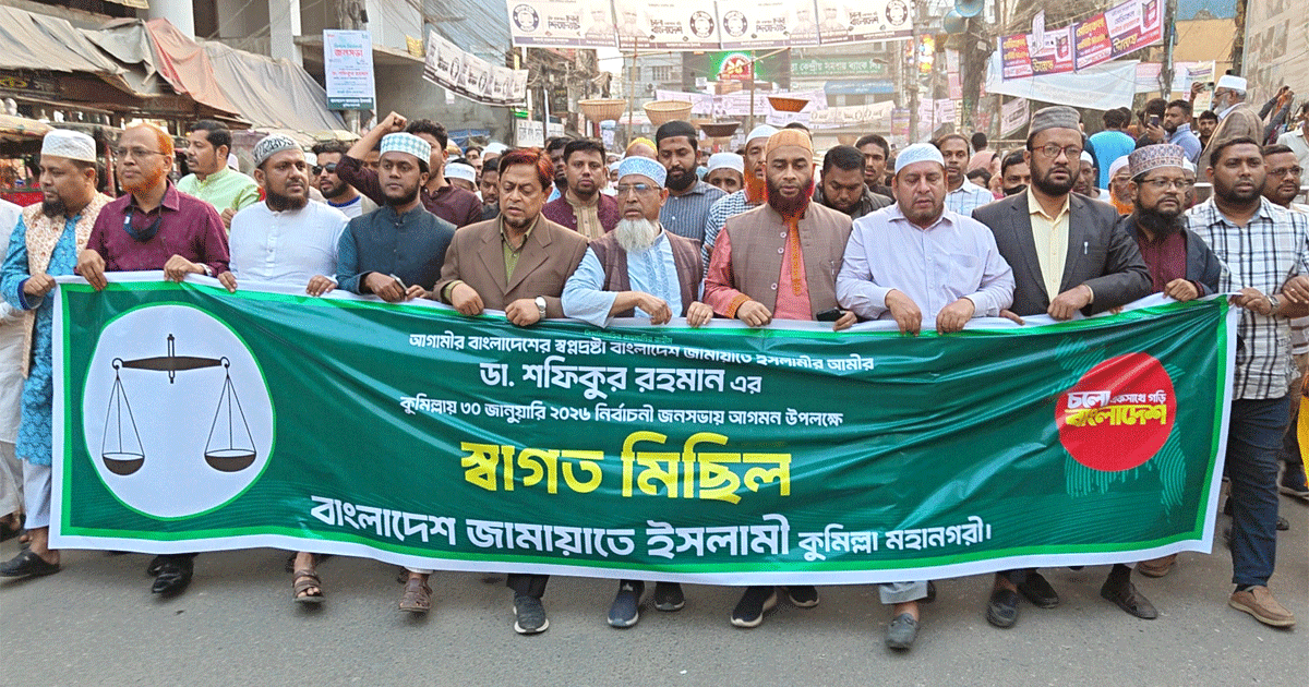 কুমিল্লা চৌদ্দগ্রাম,লাকসাম ও টাউন হল ময়দানে ৩০,৩১ জানুয়ারী বাংলাদেশ জামায়াতে ইসলামী আয়োজিত নির্বাচনী জনসভায় জামায়াতে ইসলামী'র আমীর ডা.শফিকুর রহমানের আগমন উপলক্ষে গণমিছিল বের করেন জামায়াতে ইসলামী কুমিল্লা মহানগরী।