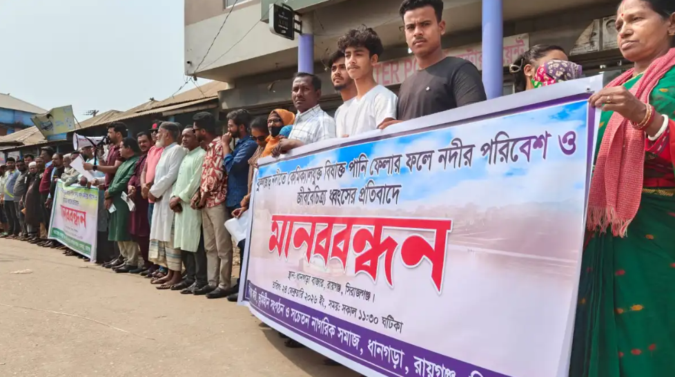সিরাজগঞ্জের রায়গঞ্জে শিল্পকারখানার বর্জ্যে ফুলজোড় নদীর পানি দূষিত হওয়ায় মাছ ও জলজ প্রাণীর মৃত্যু এবং জনভোগান্তির অভিযোগে মঙ্গলবার (২৪ ফেব্রুয়ারি) দুপুরে উপজেলার পুরাতন চৌরাস্তা মোড়ে মানববন্ধন অনুষ্ঠিত হয়েছে। ধানগড়া পরিবেশপ্রেমী সচেতন নাগরিক সমাজের উদ্যোগে আয়োজিত এ কর্মসূচিতে স্থানীয় বাসিন্দা, জেলে, ব্যবসায়ী ও বিভিন্ন রাজনৈতিক দলের নেতাকর্মীরা অংশ নেন।