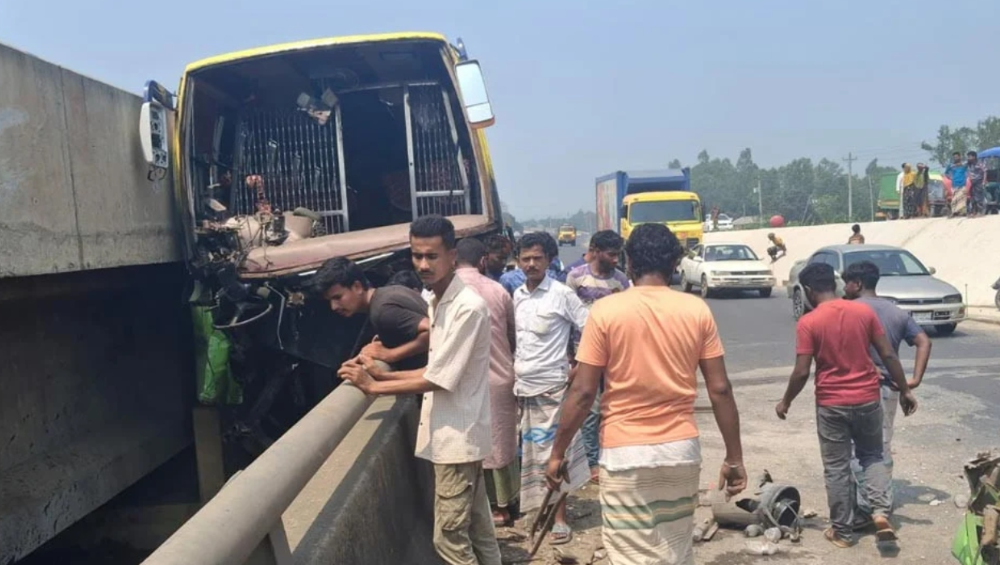 পুলিশ ও স্থানীয় সূত্রে জানা যায়, বগুড়া থেকে ময়মনসিংহগামী বুশরা পরিবহনের একটি যাত্রীবাহী বাস ঘটনাস্থলে পৌঁছলে হঠাৎ চাকা ফেটে যায়। এতে চালক বাসের নিয়ন্ত্রণ হারিয়ে ফেললে সেটি আইল্যান্ড ও ওভারব্রিজের মাঝখানে ধাক্কা লেগে আটকে যায়।