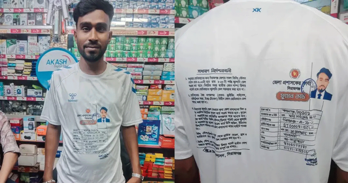 সিরাজগঞ্জের কামারখন্দ উপজেলার এক ব্যবসায়ী জেলা প্রশাসনের সরবরাহ করা ফুয়েল কার্ড গেঞ্জিতে প্রিন্ট করেছেন। এতে এলাকায় আলোচনার সৃষ্টি হয়েছে।