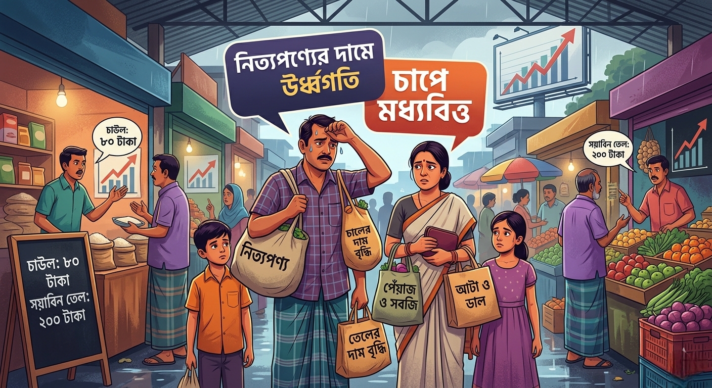 নিত্যপ্রয়োজনীয় পণ্যের লাগামহীন মূল্যবৃদ্ধিতে দেশের মধ্যবিত্ত শ্রেণি চরম চাপে পড়েছে। বৈশ্বিক অর্থনৈতিক মন্দা এবং মধ্যপ্রাচ্যের চলমান যুদ্ধ পরিস্থিতির প্রভাবে একদিকে আয় স্থবির, অন্যদিকে জীবনযাত্রার ব্যয় বেড়ে যাওয়ায় সাধারণ মানুষের দৈনন্দিন ব্যয় নির্বাহ কঠিন হয়ে উঠছে।
