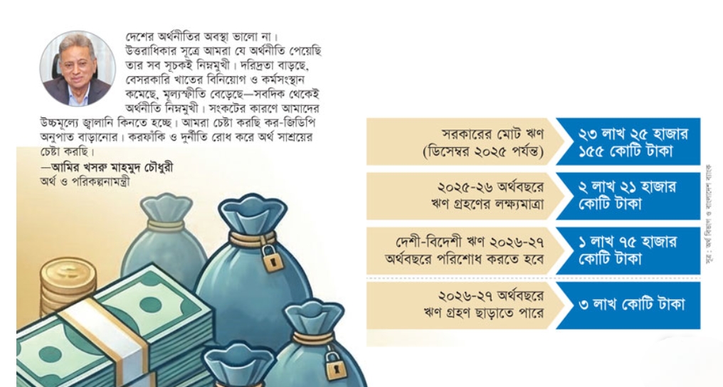 জ্বালানির উচ্চমূল্য, সরকারি কর্মচারীদের সম্ভাব্য নতুন পে-স্কেল, বড় অবকাঠামো প্রকল্পের ঋণের কিস্তি ও সুদ পরিশোধ এবং নির্বাচনী প্রতিশ্রুতি বাস্তবায়নের ব্যয় বিবেচনায় আগামী ২০২৬–২৭ অর্থবছরে সরকারের ঋণ গ্রহণ ৩ লাখ কোটি টাকা ছাড়িয়ে যেতে পারে বলে মনে করছেন সংশ্লিষ্ট বিশ্লেষক ও অর্থনীতিবিদরা।
