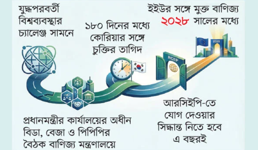 এলডিসি উত্তরণ, মধ্যপ্রাচ্য ও ইউক্রেন যুদ্ধের প্রেক্ষাপটে সৃষ্ট বৈশ্বিক বাণিজ্য চ্যালেঞ্জ মোকাবিলায় নতুন বাণিজ্য জোটে যোগ দিতে বাংলাদেশকে পরামর্শ দিয়েছে প্রধানমন্ত্রীর কার্যালয়ের অধীন তিন বিনিয়োগ ও উন্নয়ন সংস্থা। রিজিওনাল কম্প্রিহেনসিভ ইকোনমিক পার্টনারশিপে (আরসিইপি) যোগ দেওয়া, ইউরোপীয় ইউনিয়নের (ইইউ) সঙ্গে মুক্ত বাণিজ্য চুক্তি (এফটিএ) এবং দক্ষিণ কোরিয়ার সঙ্গে অগ্রাধিকারমূলক বাণিজ্য চুক্তি (পিটিএ) করার তাগিদ দিয়ে বাণিজ্য মন্ত্রণালয়ে প্রস্তাব পাঠানো হয়েছে।