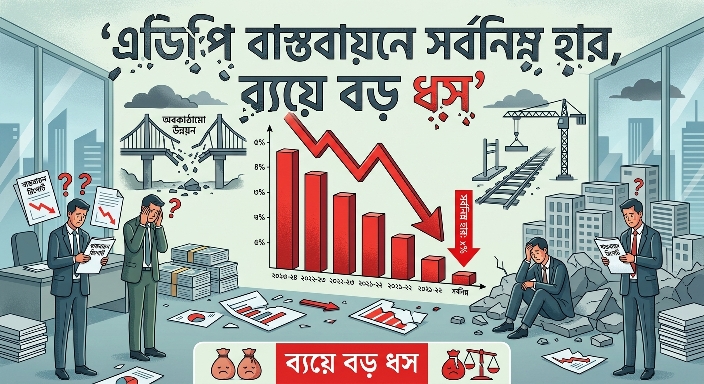 চলতি ২০২৫–২৬ অর্থবছরের প্রথম ৯ মাসে বার্ষিক উন্নয়ন কর্মসূচি এডিপি বাস্তবায়নে রেকর্ড পরিমাণ ধস নেমেছে। জুলাই থেকে মার্চ সময়ে বাস্তবায়নের হার দাঁড়িয়েছে মাত্র ৩৬ দশমিক ১৯ শতাংশে, যা গত দুই দশকের মধ্যে সর্বনিম্ন। একই সময়ে উন্নয়ন ব্যয়ও উল্লেখযোগ্যভাবে কমে গেছে, যা সরকারের উন্নয়ন ব্যবস্থাপনা ও প্রকল্প বাস্তবায়ন সক্ষমতা নিয়ে নতুন করে উদ্বেগ সৃষ্টি করেছে।