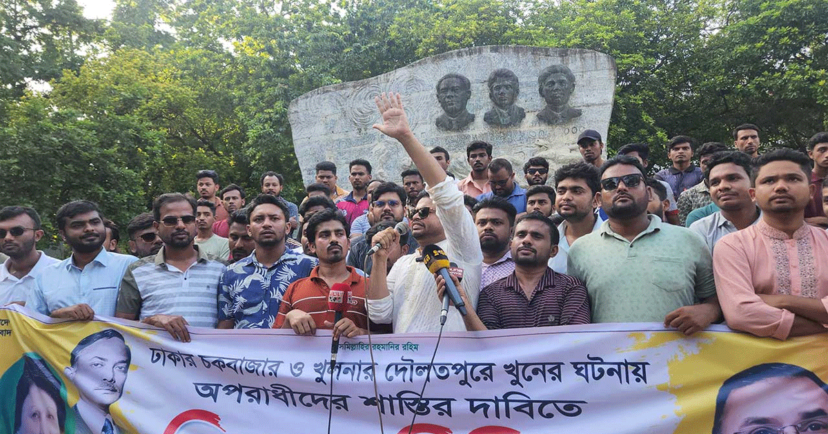 ঢাকার চকবাজার ও খুলনার দৌলতপুরে খুনের ঘটনায় অপরাধীদের দৃষ্টান্তমূলক শাস্তির দাবিতে বিক্ষোভ মিছিল করেছে রাজশাহী বিশ্ববিদ্যালয় (রাবি) শাখা ছাত্রদল।