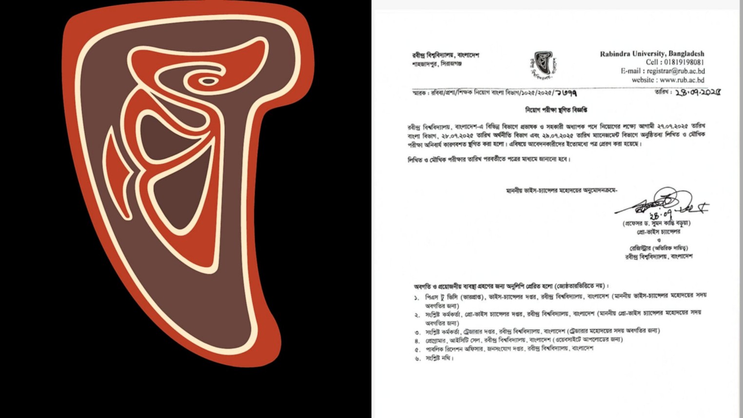রবীন্দ্র বিশ্ববিদ্যালয়ে চলমান প্রভাষক ও সহকারী অধ্যাপক পদের নিয়োগ পরীক্ষা অনিবার্য কারণে স্থগিত করা হয়েছে। বিশ্ববিদ্যালয় কর্তৃপক্ষের জারি করা এক বিজ্ঞপ্তিতে এ তথ্য জানানো হয়।