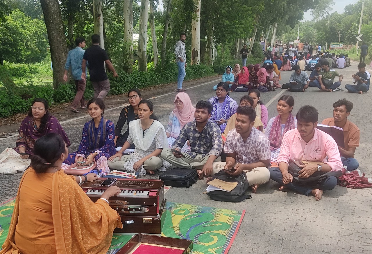 রবীন্দ্র বিশ্ববিদ্যালয়ের স্থায়ী ক্যাম্পাস নির্মাণে দ্রুত ডিপিপি (উন্নয়ন প্রকল্প প্রস্তাবনা) অনুমোদনের দাবিতে পঞ্চম দিনের মতো আন্দোলন চালিয়ে যাচ্ছেন শিক্ষার্থীরা। মঙ্গলবার (২৯ জুলাই) সকাল ১০টা থেকে দুপুর ১২টা পর্যন্ত বিশ্ববিদ্যালয়ের সংগীত বিভাগের শিক্ষার্থীরা ঢাকা-পাবনা মহাসড়কে বসেই গানে গানে ক্লাস পরিচালনা করেন।