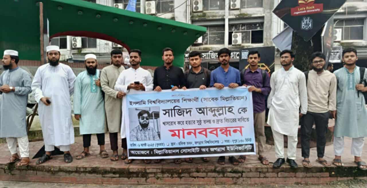 ইসলামী বিশ্ববিদ্যালয়ের (ইবি) শিক্ষার্থী ও সাবেক মিল্লাতিয়ান সাজিদ আব্দুল্লাহকে শ্বাসরোধ করে হত্যার সুষ্ঠু তদন্ত ও দ্রুত বিচারের দাবিতে মানববন্ধন করেছে মিল্লাতিয়ানস সোসাইটি অব জগন্নাথ ইউনিভার্সিটির শিক্ষার্থীরা।