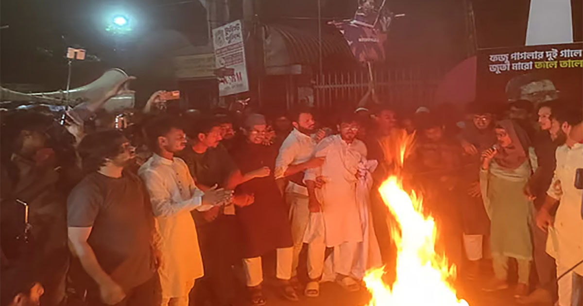 এ সময় ফজলুর রহমানের কুশপুত্তলিকা দাহ ও তার ছবিতে জুতা নিক্ষেপ করা হয়।