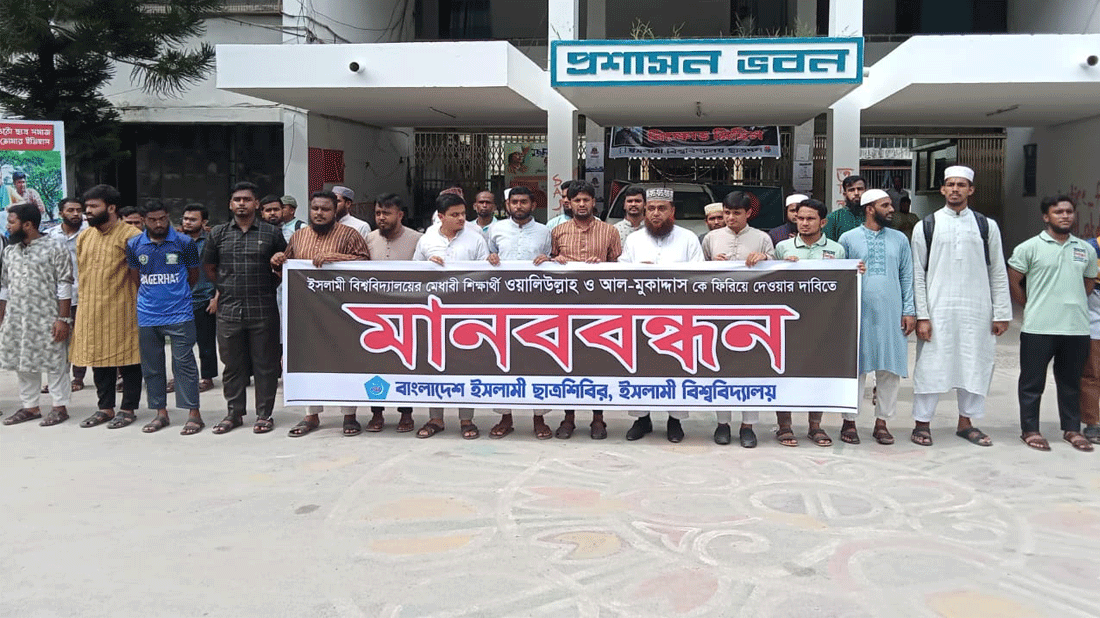 কুষ্টিয়ার ইসলামী বিশ্ববিদ্যালয়ের (ইবি) গুম হওয়া দুই শিক্ষার্থী ওয়ালিউল্লাহ ও আল–মুকাদ্দাসের সন্ধান ও ফিরিয়ে দেওয়ার দাবিতে মানববন্ধন করেছে ছাত্রশিবির ইসলামী বিশ্ববিদ্যালয় শাখা।