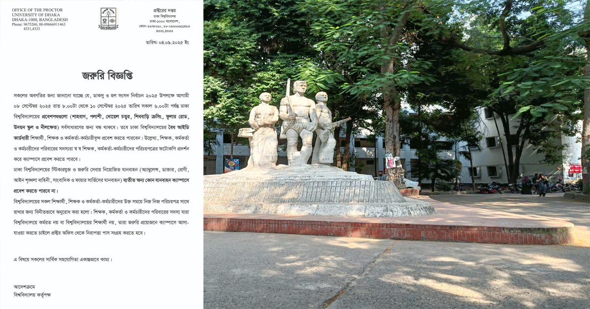 এতে বলা হয়, ডাকসু ও হল সংসদ নির্বাচন উপলক্ষে আগামী সোমবার রাত ৮টা থেকে বুধবার সকাল ৬টা পর্যন্ত ঢাকা বিশ্ববিদ্যালয়ের প্রবেশপথগুলো (শাহবাগ, পলাশী, দোয়েল চত্বর, শিববাড়ি ক্রসিং, ফুলার রোড, উদয়ন স্কুল ও নীলক্ষেত) সর্বসাধারণের জন্য বন্ধ থাকবে। তবে ঢাকা বিশ্ববিদ্যালয়ের বৈধ আইডি কার্ডধারী শিক্ষার্থী, শিক্ষক ও কর্মকর্তা-কর্মচারীবৃন্দ প্রবেশ করতে পারবেন।