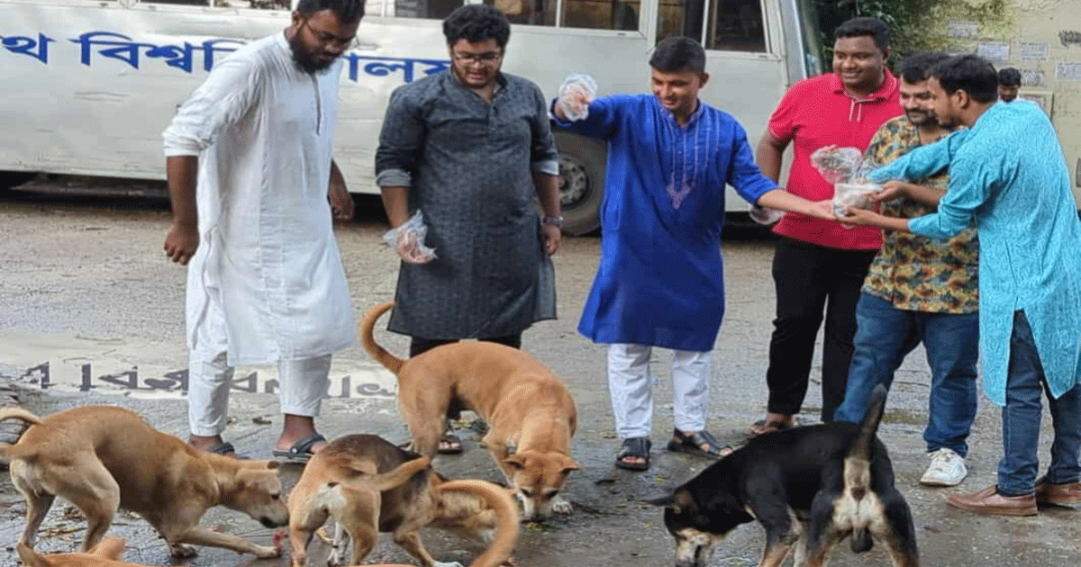 পূজার ছুটিতে দীর্ঘদিন ধরে জগন্নাথ বিশ্ববিদ্যালয় (জবি) ক্যাম্পাস বন্ধ থাকায় ভেতরে অবস্থানরত কুকুরগুলো খাবারের সংকটে পড়ে। এমন পরিস্থিতিতে বিশ্ববিদ্যালয় শাখা ছাত্রদলের নেতাকর্মীরা এগিয়ে এসে প্রাণীগুলোর জন্য খাবারের ব্যবস্থা করেন।