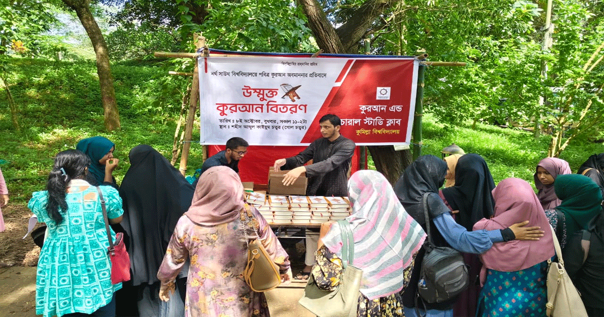 কুমিল্লা বিশ্ববিদ্যালয়ে (কুবি) নর্থ সাউথ বিশ্ববিদ্যালয়ে পবিত্র কোরআন অবমাননার প্রতিবাদে উন্মুক্ত কোরআন বিতরণ কর্মসূচি পালন করেছে কুমিল্লা বিশ্ববিদ্যালয়ের কোরআন অ্যান্ড কালচারাল স্টাডি ক্লাব।