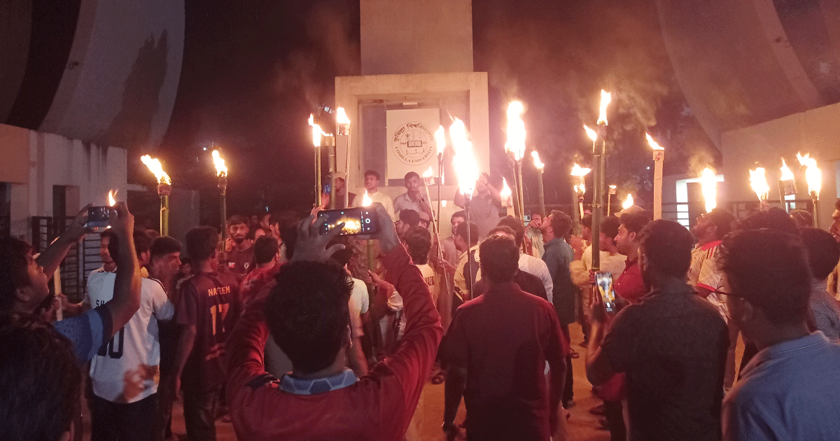 শুক্রবার (১৭ অক্টোবর) রাত সাড়ে ৮টায় বিশ্ববিদ্যালয়ের মূল ফটকে "জাগো বাহে, কোনঠে সবাই, তিস্তা বাঁচাও, মানুষ বাঁচাও" স্লোগানকে সামনে রেখে এই মিছিল করেন তাঁরা।