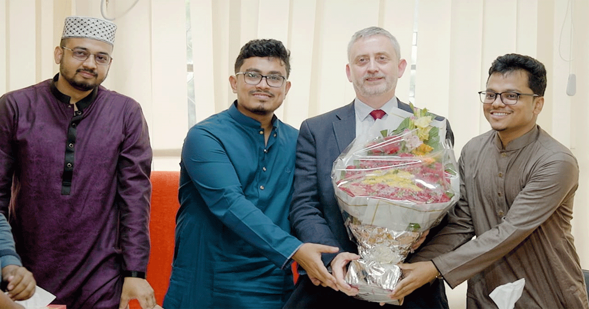 বৃহস্পতিবার (৩০ অক্টোবর) রাষ্ট্রদূত ও তাঁর প্রতিনিধিদল ডাকসু ভবনে পৌঁছালে ডাকসুর সহ-সভাপতি (ভিপি) সাদিক কায়েম, সাধারণ সম্পাদক (জিএস) এস এম ফরহাদ সহ অন্যান্য নেতৃবৃন্দ তাদেরকে ফুলেল শুভেচ্ছা জানান।