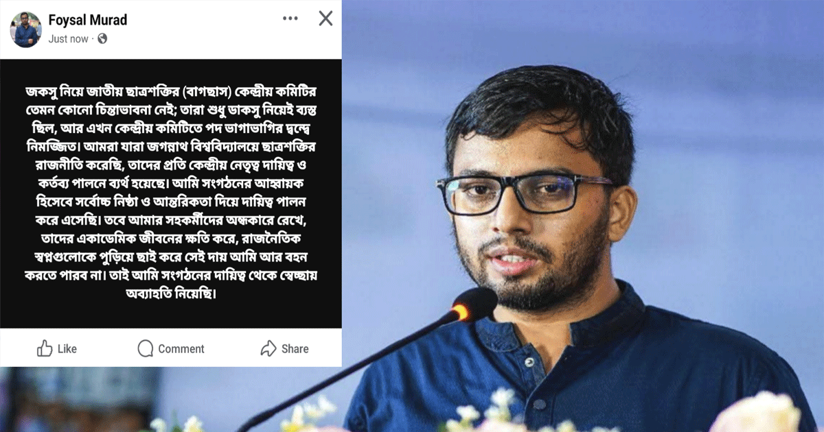 জাতীয় ছাত্রশক্তি জগন্নাথ বিশ্ববিদ্যালয় (জবি) শাখার আহ্বায়ক ফয়সাল মুরাদ সংগঠনটির দায়িত্ব থেকে পদত্যাগ করেছেন।