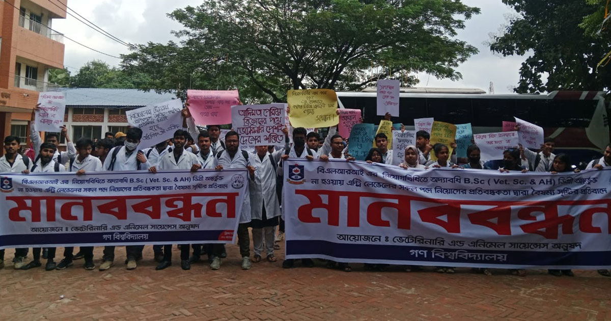 বাংলাদেশ লাইভস্টক রিসার্চ ইনস্টিটিউটের (বিএলআরআই) নিয়োগবিধিতে পশু চিকিৎসা ও পশু পালন বিষয়ে সমন্বিত বিএসসি ডিগ্রি (B.Sc. in Vet. Sci. & A.H.) অন্তর্ভুক্ত না করায় নিয়োগে বৈষম্যের প্রতিবাদে মানববন্ধন ও প্রতিবাদ কর্মসূচি পালন করেছেন গণ বিশ্ববিদ্যালয়ের (গবি) ভেটেরিনারি অ্যান্ড অ্যানিমেল সায়েন্সেস অনুষদের শিক্ষার্থীরা।