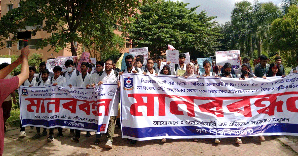 বাংলাদেশ লাইভস্টক রিসার্চ ইনস্টিটিউটের (বিএলআরআই) নিয়োগবিধিতে পশু চিকিৎসা ও পশু পালন বিষয়ে সমন্বিত বিএসসি ডিগ্রি (B.Sc. in Vet. Sci. & A.H.) অন্তর্ভুক্ত না করায় নিয়োগে বৈষম্যের প্রতিবাদে মানববন্ধন ও প্রতিবাদ কর্মসূচি পালন করেছেন গণ বিশ্ববিদ্যালয়ের (গবি) ভেটেরিনারি অ্যান্ড অ্যানিমেল সায়েন্সেস অনুষদের শিক্ষার্থীরা।