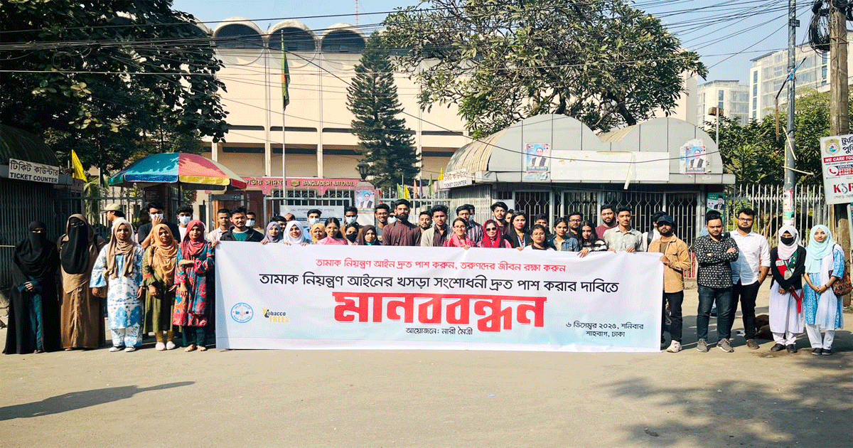 শনিবার (৬ ডিসেম্বর ২০২৫) সকালে বেসরকারী সংস্থা নারী মৈত্রীর আয়োজনে শাহবাগ জাতীয় জাদুঘরের সামনে আয়োজিত এই মানবন্ধনে তামাকবিরেধী ইয়ূথ ফোরামের সদস্যরা এই দাবি তুলে ধরেন।
