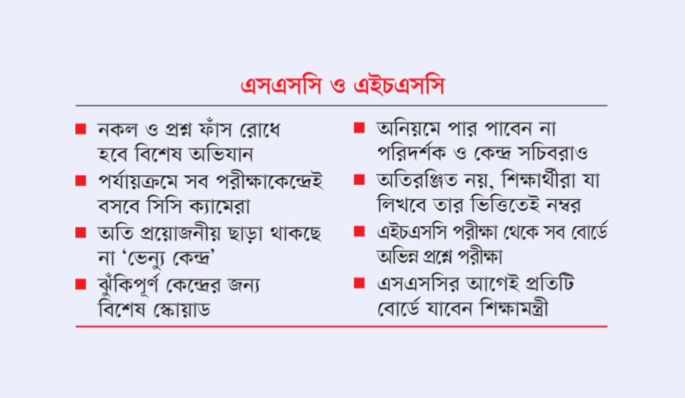 শিক্ষামন্ত্রী ড. আ ন ম এহছানুল হক মিলন জানিয়েছেন, শুরুতে ঝুঁকিপূর্ণ কেন্দ্রগুলোতে ক্লোজ সার্কিট ক্যামেরা বসানো হবে এবং পর্যায়ক্রমে সব কেন্দ্রে তা বাধ্যতামূলক করা হবে। কোনো কেন্দ্রে অনিয়ম প্রমাণিত হলে শুধু পরীক্ষার্থী নয়, সংশ্লিষ্ট শিক্ষক ও কর্মকর্তাদের বিরুদ্ধেও কঠোর বিভাগীয় ব্যবস্থা নেওয়া হবে।