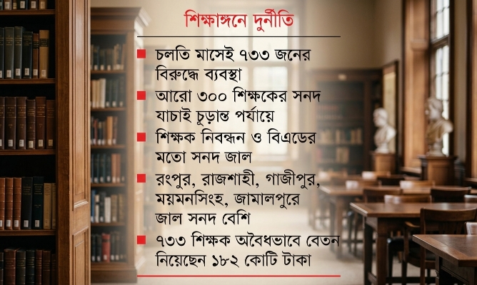 মাধ্যমিক ও উচ্চ মাধ্যমিক পর্যায়ে জাল সনদে নিয়োগ পাওয়া ৭৩৩ জন শিক্ষক-কর্মচারীর বিরুদ্ধে কঠোর ব্যবস্থা নেওয়া শুরু করেছে সরকার। এর মধ্যে ৪৭১ জনকে ইতোমধ্যে চাকরিচ্যুত করা হয়েছে এবং বাকি ২৬২ জনের বিরুদ্ধে ব্যবস্থা প্রক্রিয়াধীন রয়েছে। অভিযুক্তরা জাল সনদের মাধ্যমে চাকরি নিয়ে এখন পর্যন্ত সরকারি তহবিল থেকে ১৮২ কোটি টাকার বেশি বেতন-ভাতা নিয়েছেন।