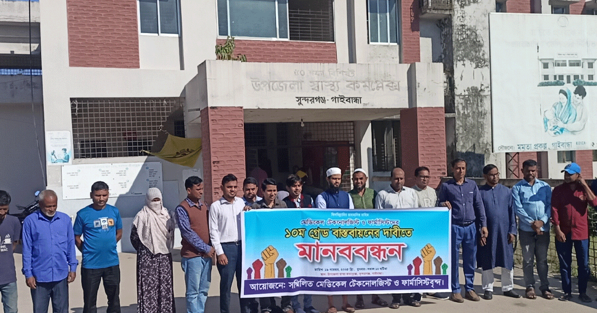 সরকারি হাসপাতালসমূহে কর্মরত মেডিকেল টেকনোলজিস্ট ও ফার্মাসিস্টদের পদমর্যাদা ১১তম গ্রেড থেকে ১০ম গ্রেডে উন্নীতকরণের দাবিতে গাইবান্ধার সুন্দরগঞ্জে মানববন্ধন অনুষ্ঠিত হয়েছে।