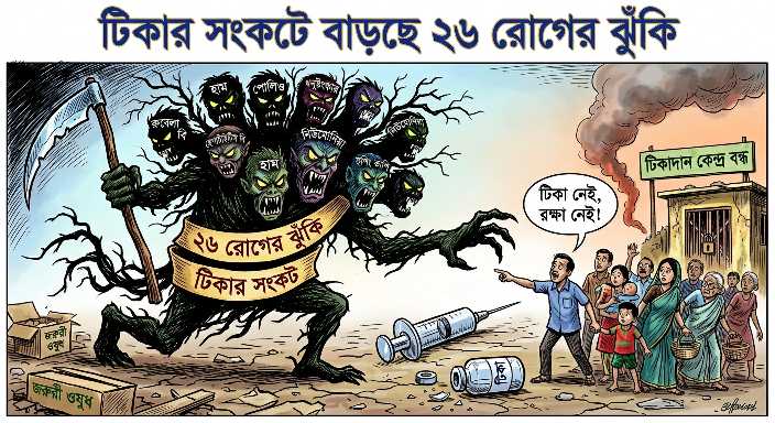 দেশে টিকার ঘাটতি ও প্রতিরোধমূলক কর্মসূচি বন্ধ হয়ে যাওয়ায় সংক্রামক ও অসংক্রামক মিলিয়ে অন্তত ২৬টি রোগের ঝুঁকি বাড়ছে। সংশ্লিষ্টদের মতে, অপারেশন প্ল্যান (ওপি) বন্ধ এবং টিকা সংগ্রহে জটিলতার কারণে স্বাস্থ্য খাতে বড় ধরনের স্থবিরতা তৈরি হয়েছে, যার প্রভাব ইতোমধ্যে জনস্বাস্থ্যে পড়তে শুরু করেছে।